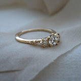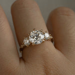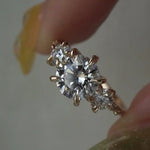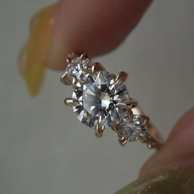 Inspired by the beauty of symmetry, this ring features a round brilliant gemstone with two pear-shaped side stones. The balanced design and timeless style make it an ideal choice for someone who appreciates classic elegance with a modern twist.