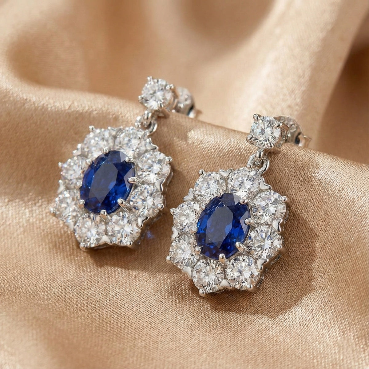 Solarii Oval Cut Blue Stone Halo Drop Earrings in Sterling Silver