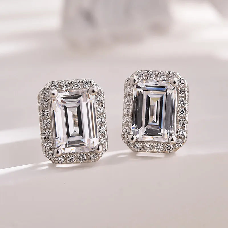 Solarii Halo Emerald Cut Stud Earrings In Sterling Silver