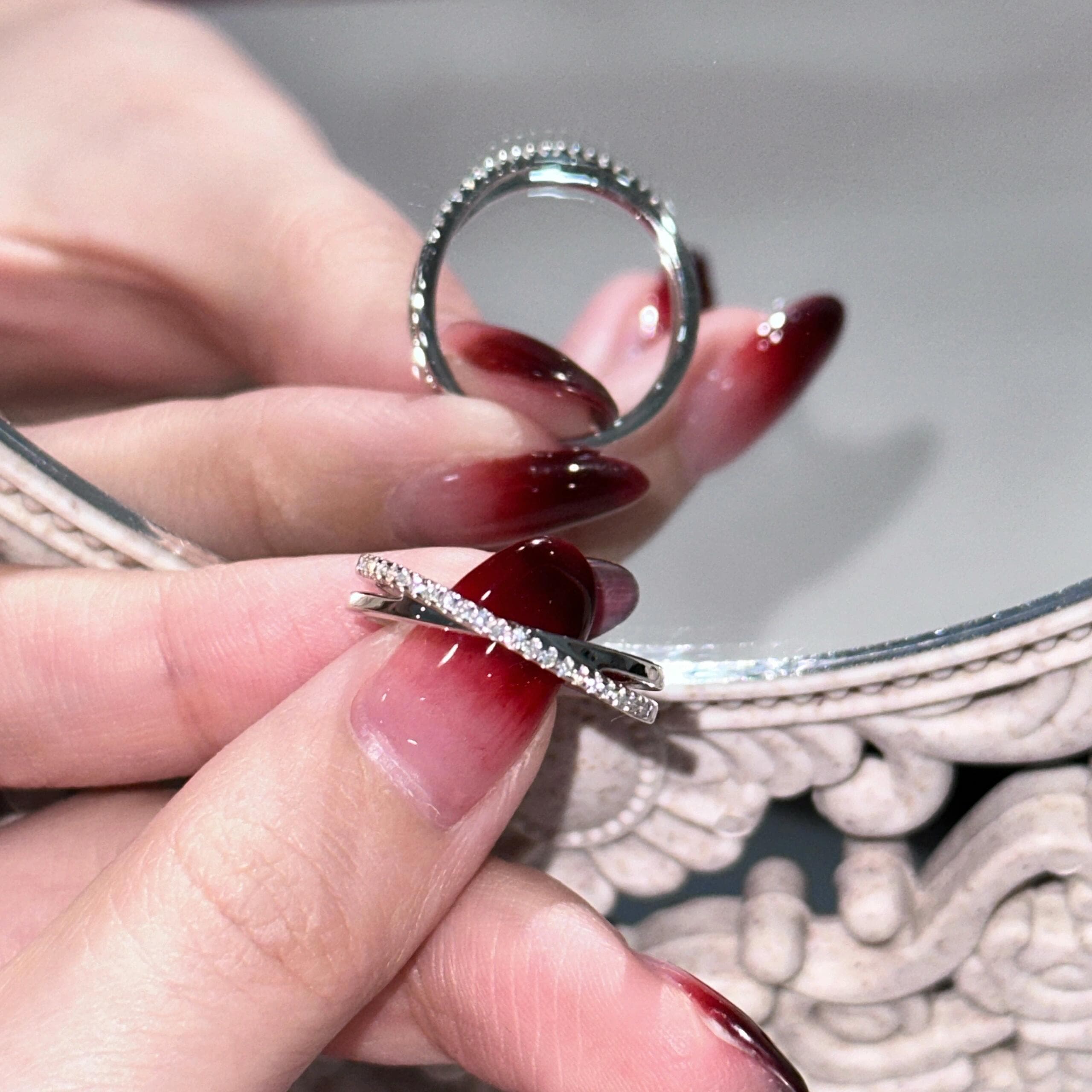 This ring showcases a modern twist on a classic design, with intersecting bands of gems creating a dynamic look. It's a bold statement piece for those who love contemporary style.