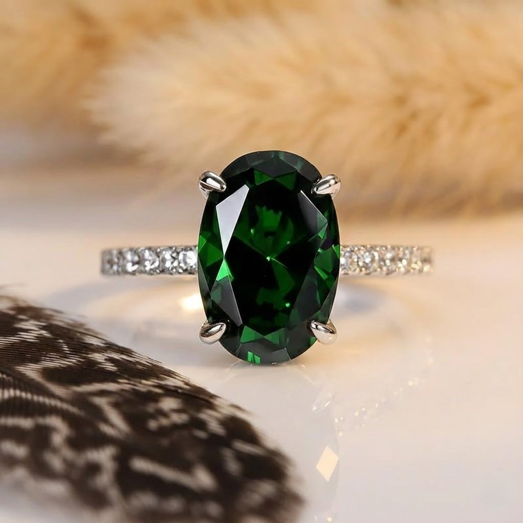 Classic Oval Cut 3.5ct Emerald Green Hidden Halo Engagement Ring In Sterling Silver