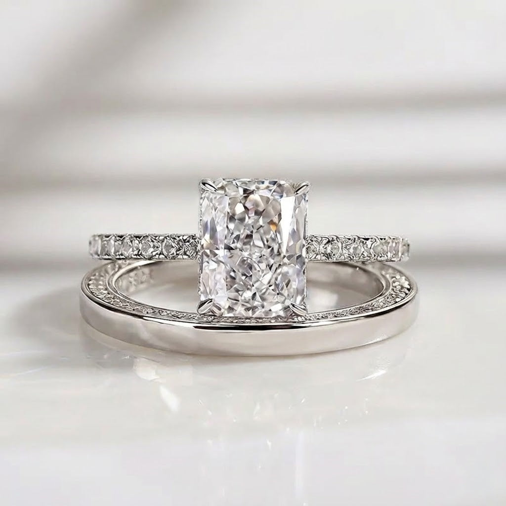 This ring features a Radiant Cut Cubic Zirconia as the centerpiece, radiating unparalleled brilliance. Paired with a sleek and refined white gold-plated finish, it exudes elegance and modern style. The double-band design symbolizes love and commitment, with the luminous center stone beautifully complemented by the sparkle of smaller surrounding stones. Perfect for those who seek a harmonious blend of classic charm and contemporary aesthetics.