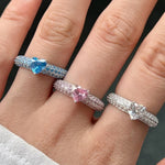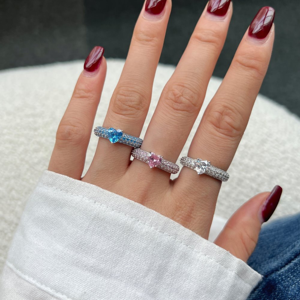 This engagement ring is inspired by the symbols of romance and eternity. The gemstones set in the ring come in three different colors, each representing a different stage of love: blue symbolizes the initial spark of attraction, pink reflects the sweetness and tenderness of being in love, and the clear stone represents the pure and timeless promise of eternal love. The overall design of the ring is elegant and minimalist, highlighting the brilliance of the central gemstone. It beautifully combines classic and modern elements, symbolizing the heartfelt vow of a lifelong commitment.