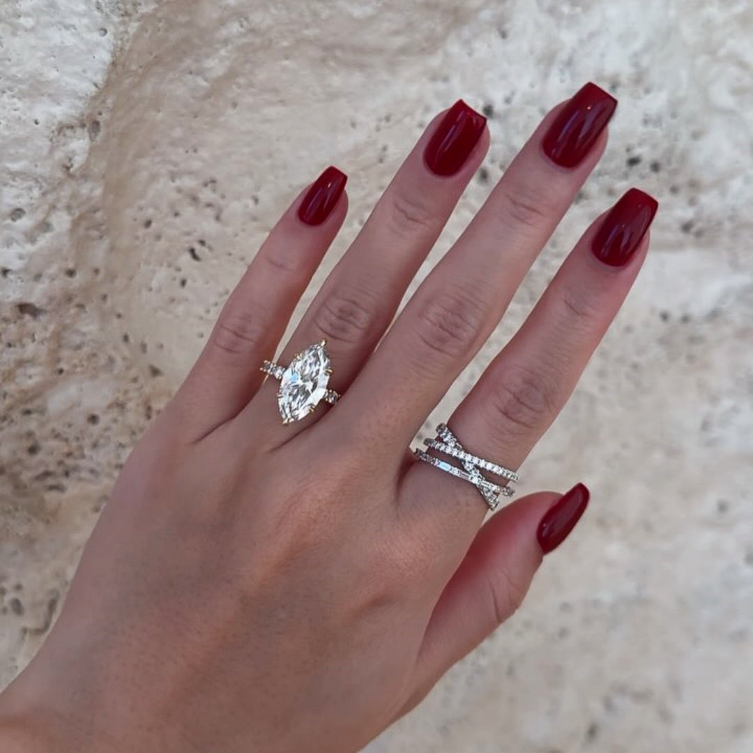 This exquisite engagement ring features a stunning 4.0ct marquise cut centerpiece enhanced by delicate pavé detailing. Crafted in high-quality sterling silver, the sophisticated design balances timeless elegance with contemporary styling. The marquise cut maximizes brilliance while creating the illusion of longer, more slender fingers. A remarkable statement piece that offers luxury and craftsmanship at exceptional value.