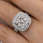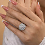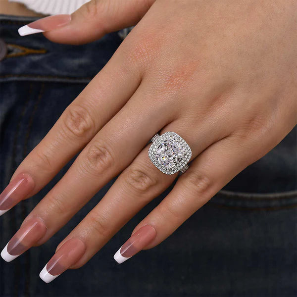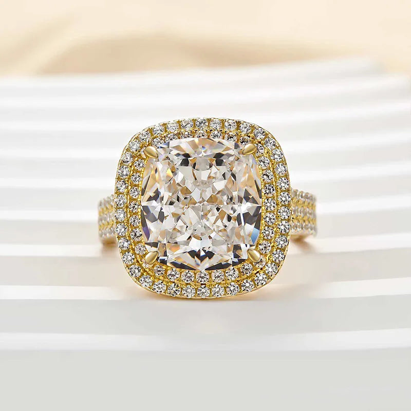 Inspired by timeless glamour, this ring features a cushion-cut center gemstone surrounded by a double halo of sparkling gems. The intricate design enhances the brilliance of the center stone, making it a true showstopper.