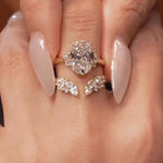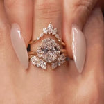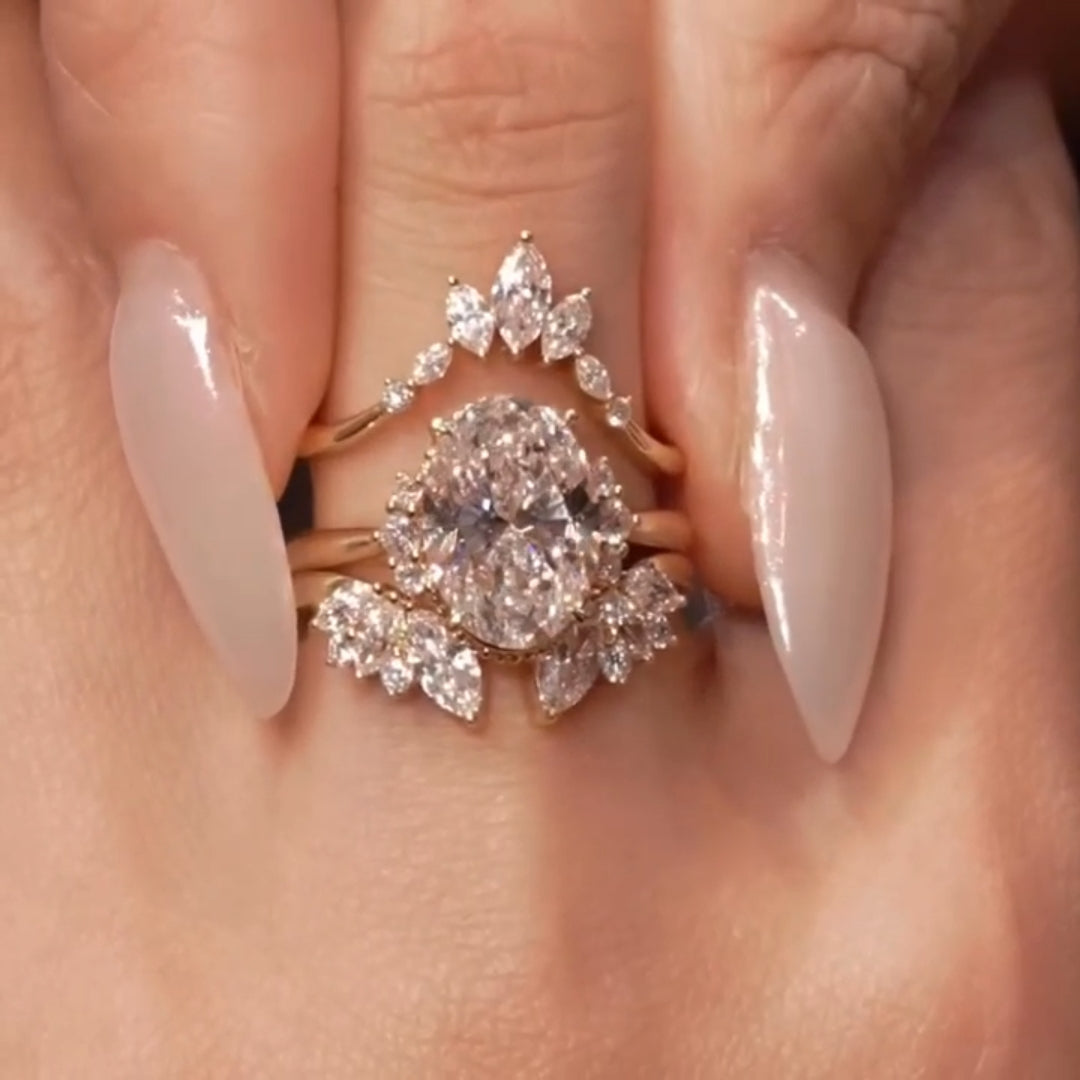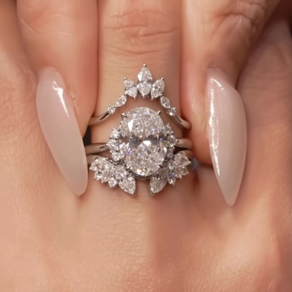 A refined three-piece wedding ring set anchored by a luminous 5.0 carat oval solitaire in a vintage crown setting. Rendered in 925 sterling silver, this collection balances classic proportions with contemporary stackability—wear the complete set for ceremonial elegance or layer individual pieces for understated daily sophistication. The oval cut delivers exceptional light performance while the crown mounting adds architectural depth and vintage character. Designed for those who demand both heritage aesthetics and modern flexibility in their bridal jewelry.